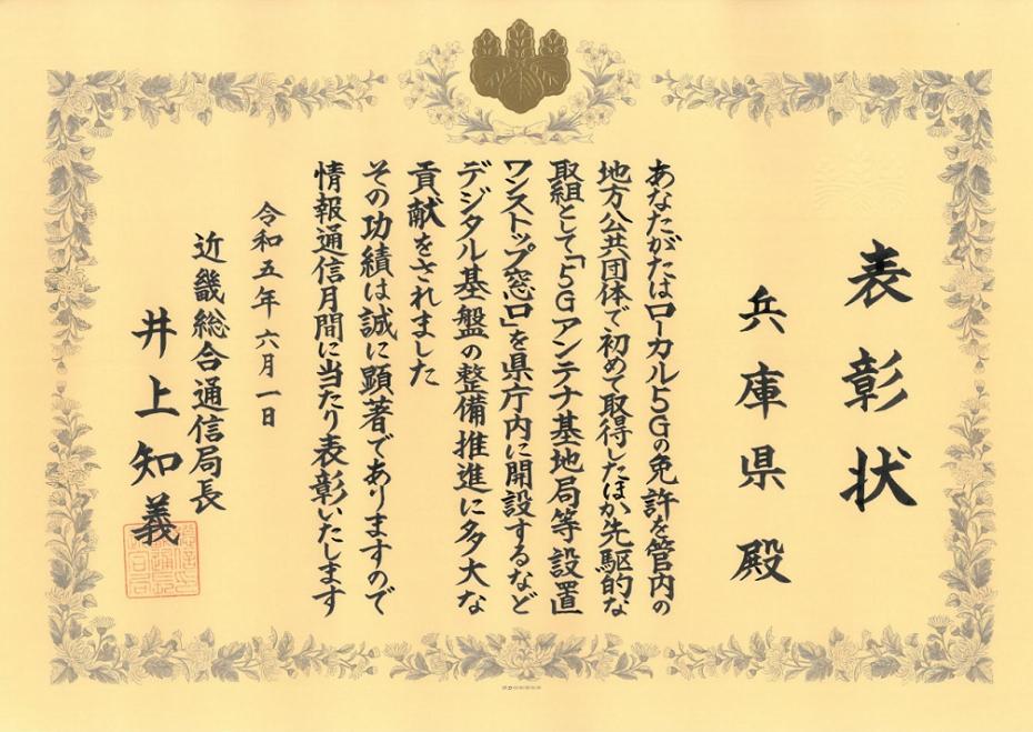 兵庫県のローカル5Gの普及推進の取組が評価され、令和5年度情報通信月間近畿総合通信局長表彰を受賞しました。