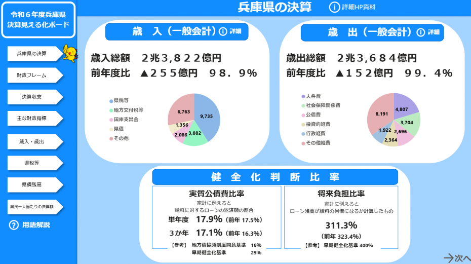 決算見える化ボード兵庫県の決算状況を可視化 ![]() (外部サイトへリンク)(別ウィンドウで開きます) |