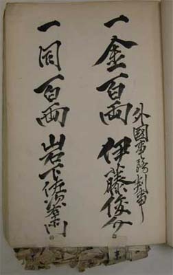 募金のリストには外国事務判事であった伊藤俊介(博文)の名も見えますが、未納の付箋が貼られています。
