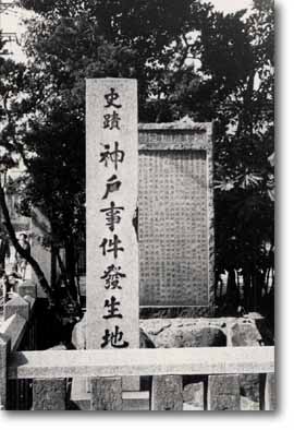 慶応4年(1868)1月、江戸幕府最後の将軍であった徳川慶喜は、鳥羽・伏見の戦いで新政府軍に敗れ、大阪を脱出するなどしていました。1月1日、新政府によって西宮の警備を命ぜられた備前(岡山)藩の兵隊が神戸の三宮神社前を行進していたとき、外国の水兵が隊列を横切ったのがきっかけで、藩兵が発砲し、英・仏・米の守備兵がこれに応戦しました。外国側は、大阪湾内の諸藩の艦船6隻をすべて抑留し、神戸にあった居留地(当時は造成中)を軍事的に占領しました。