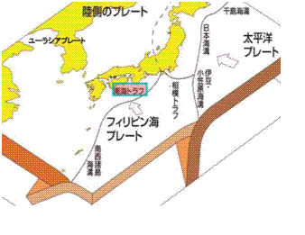 南海トラフは、日本列島が位置する大陸のプレートの下に、海洋プレートのフィリピン海プレートが南側から年間数センチの割合で沈み込んでいる場所です。この沈み込みに伴い、2つのプレートの境界にはひずみが蓄積されており、100~200年の間隔で蓄積されたひずみを解放する大地震が発生しています。