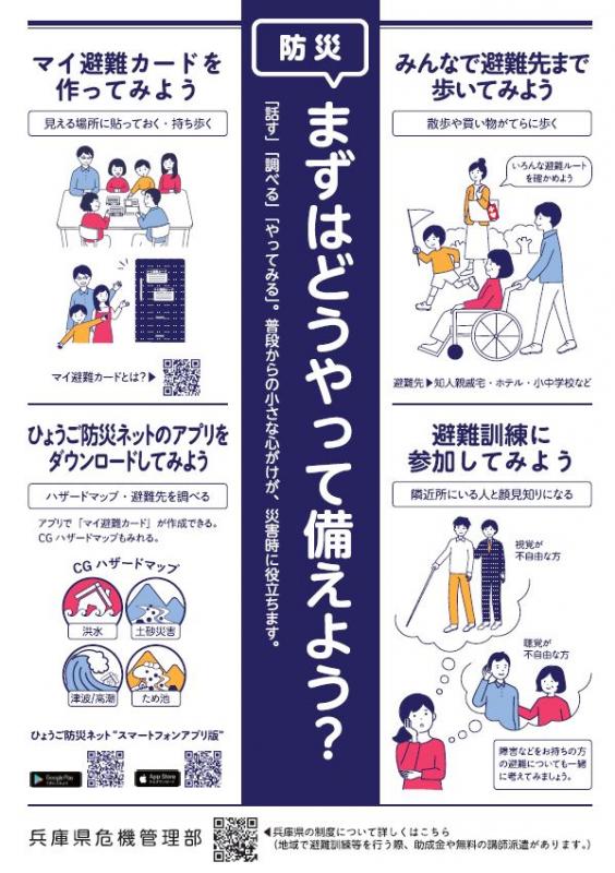 兵庫県では、県民のみなさんの「自助」「共助」に繋がる取組として、「自助」の取組であるマイ避難カード等の普及や、「共助」の取組である避難行動要支援者の個別避難計画の作成を支援しています。