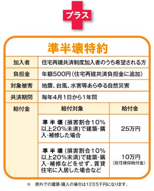自然災害により準半壊(損害割合10%以上20%未満)の被害を受けた加入者には、(1)住宅を再建・購入・補修した場合に25万円、(2)再建・購入・補修しない場合には10万円(居住確保給付金)の共済給付金をお支払いします。