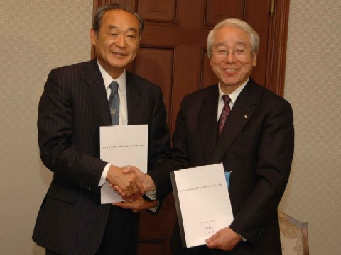 平成19年1月19日、日本郵政公社の生田正治総裁と井戸知事が、郵便局での加入申込書の受付や、郵便局のネットワークを活用したフェニックス共済の推進等について合意書に署名しました。
