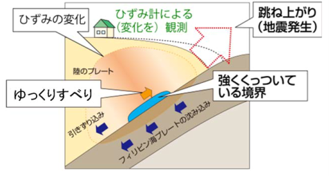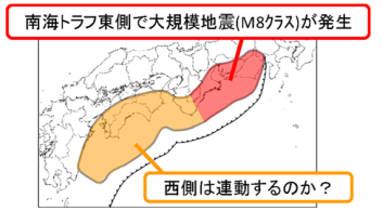 | 南海トラフの想定地震域内の領域で大規模地震が発生し、残りの領域で大規模地震発生の可能性が高まったと評価された場合 | 南海トラフ沿いで大規模地震に比べて一回り小さい地震(M7.0以上、M8.0未満)が発生した場合を想定 | 短い期間にプレート境界の固着状態が明らかに変化しているような通常とは異なるゆっくりすべりが観測された場合 |