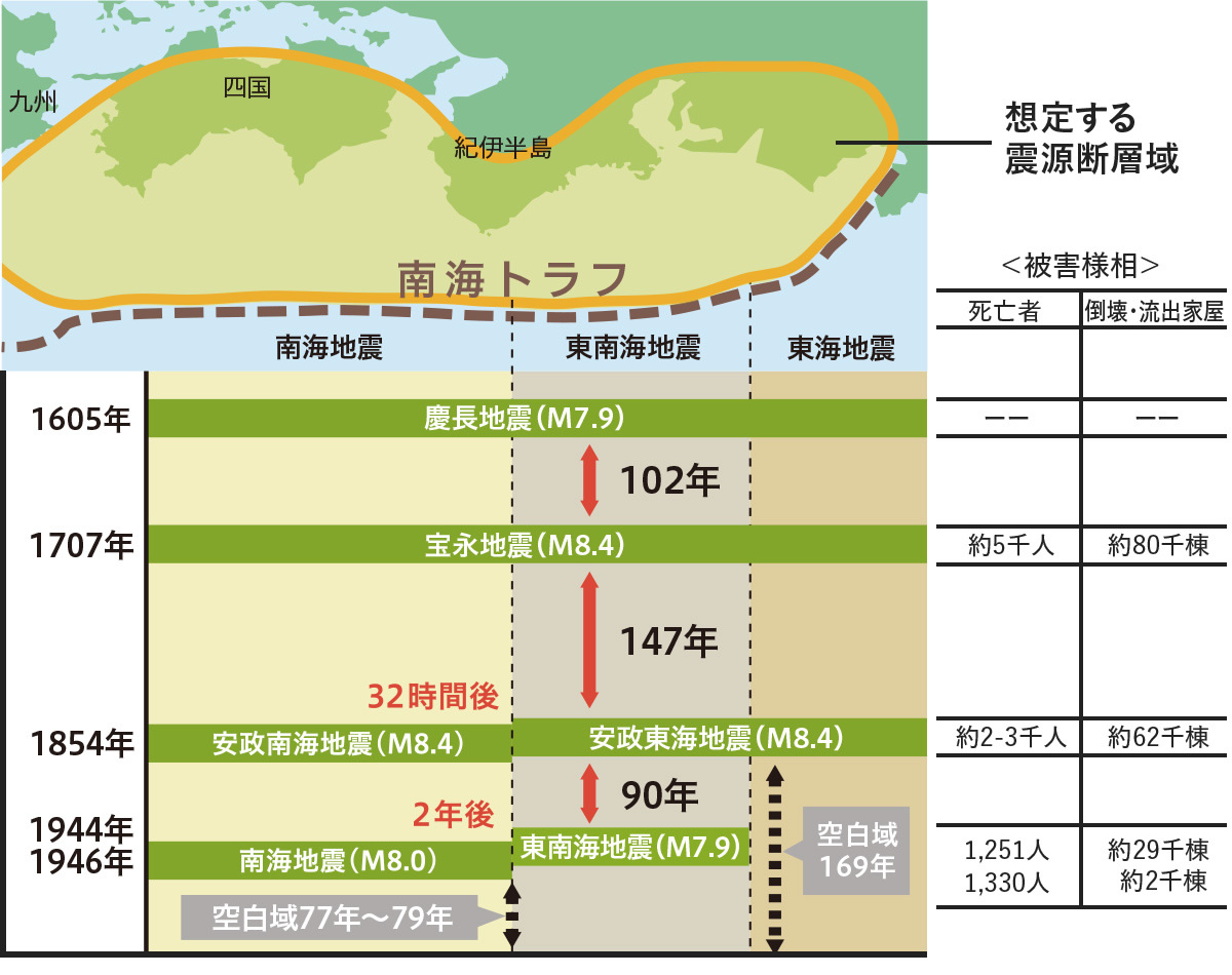 南海トラフでは、繰り返し大地震が発生してきました。近年では1944年に東南海地震、1946年に南海地震が発生し、地震動や津波により甚大な被害が生じました。これらの地震発生からすでに70年以上経過し、南海トラフにおける次の大地震発生の可能性が高まっています。