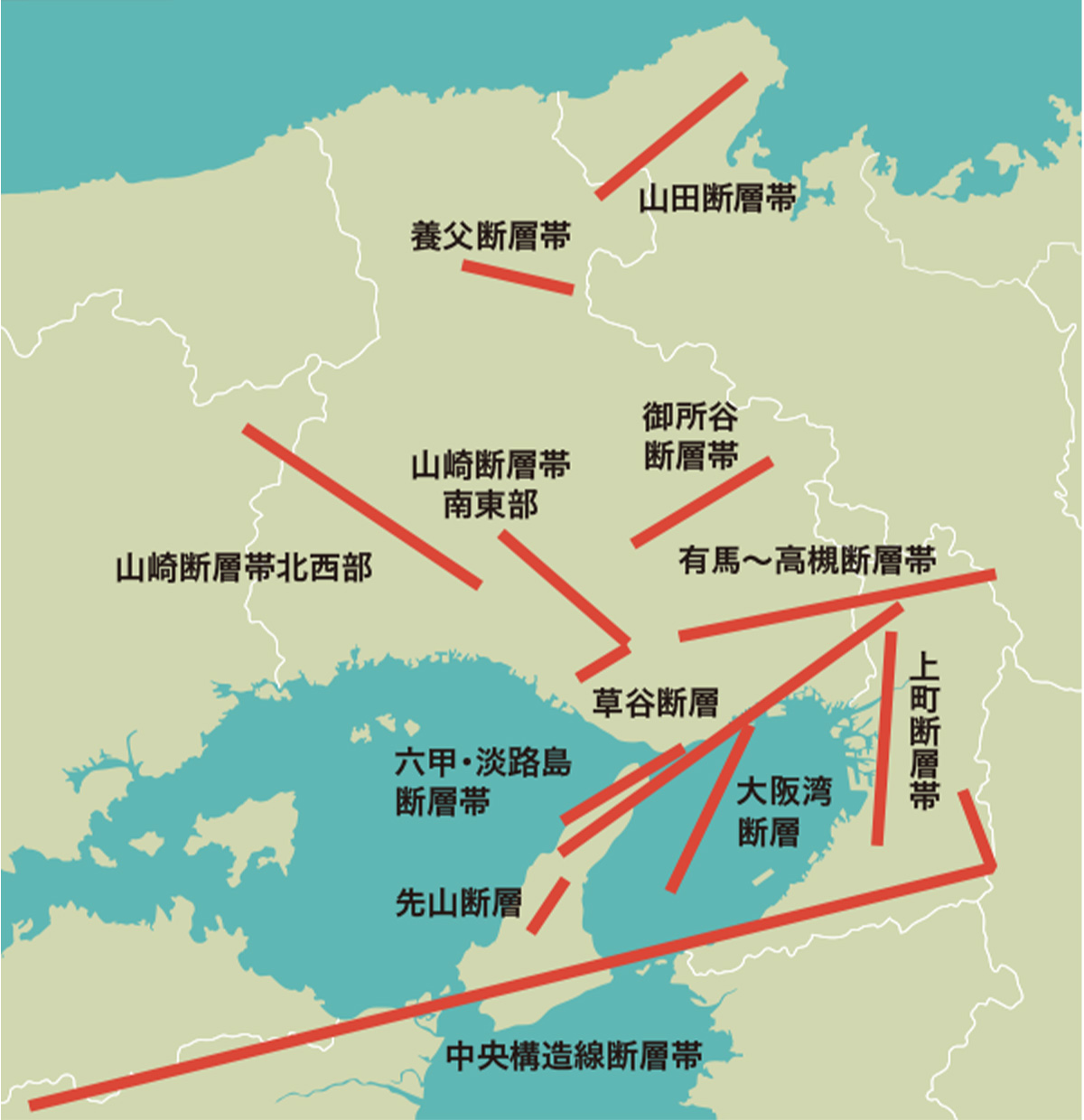 兵庫県内には六甲・淡路島断層帯、有馬~高槻断層帯、山崎断層帯、中央構造線断層帯、また、大阪府には上町断層帯など多くの活断層が分布しており、強い揺れを伴う地震の発生が想定されます。