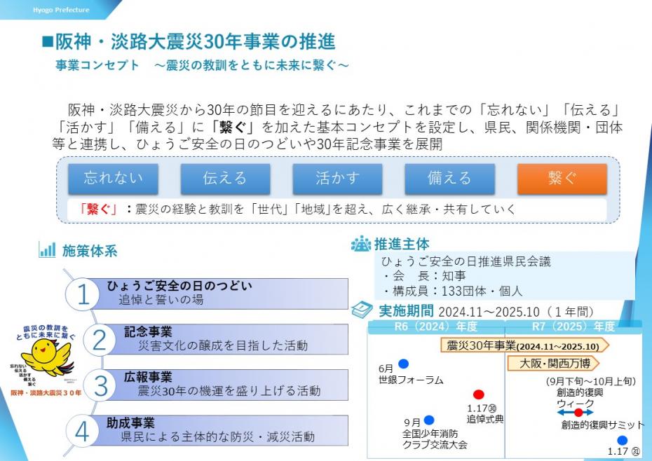 阪神・淡路大震災から30年の節目を迎えるにあたり、これまでの「忘れない」「伝える」「活かす」「備える」に「繋ぐ」を加えた基本コンセプトを設定し、県民、関係機関・団体等と連携し、ひょうご安全の日のつどいや30年記念事業を展開します。