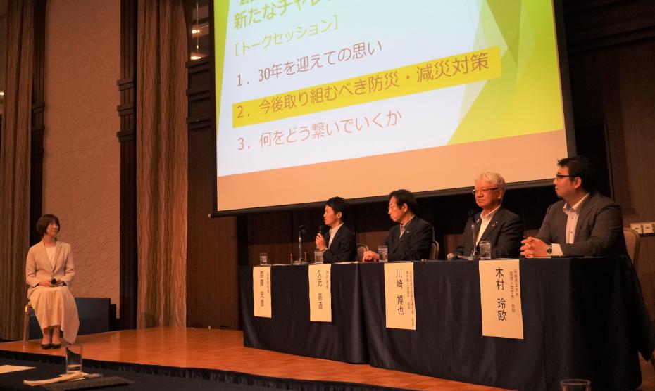 シンポジウムでは、阪本教授と木村教授から大規模災害への備えや防災教育について、基調講演していただいた後に、阪本教授をモデレーターとしたトークセッションを実施しました。トークセッションでは、最初に齋藤知事、久元市長、川崎会頭から震災から30年を迎えることについて所感や思いをそれぞれ述べ、今後取り組むべき災害対策や世代交代する中で何をどう繋いでいくかなどについて活発に議論しました。