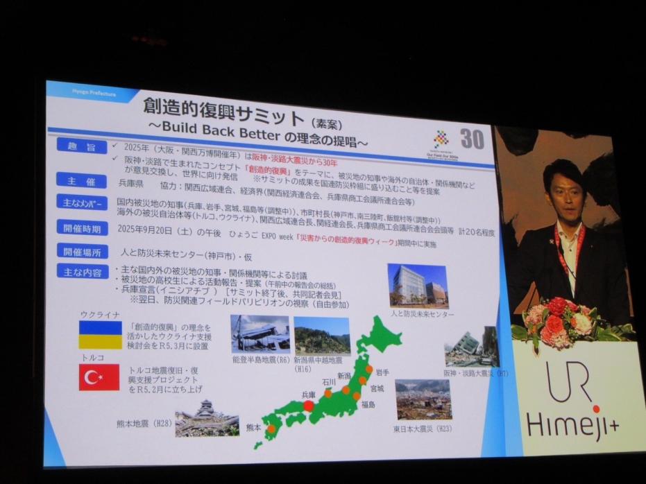 本県の大規模災害からの経験や教訓が世界各国の災害対策に活かされるよう、「阪神・淡路大震災の教訓」、「国際防災への貢献」、「震災30年及び大阪・関西万博に向けて」の3つを議題に基調講演を行いました。