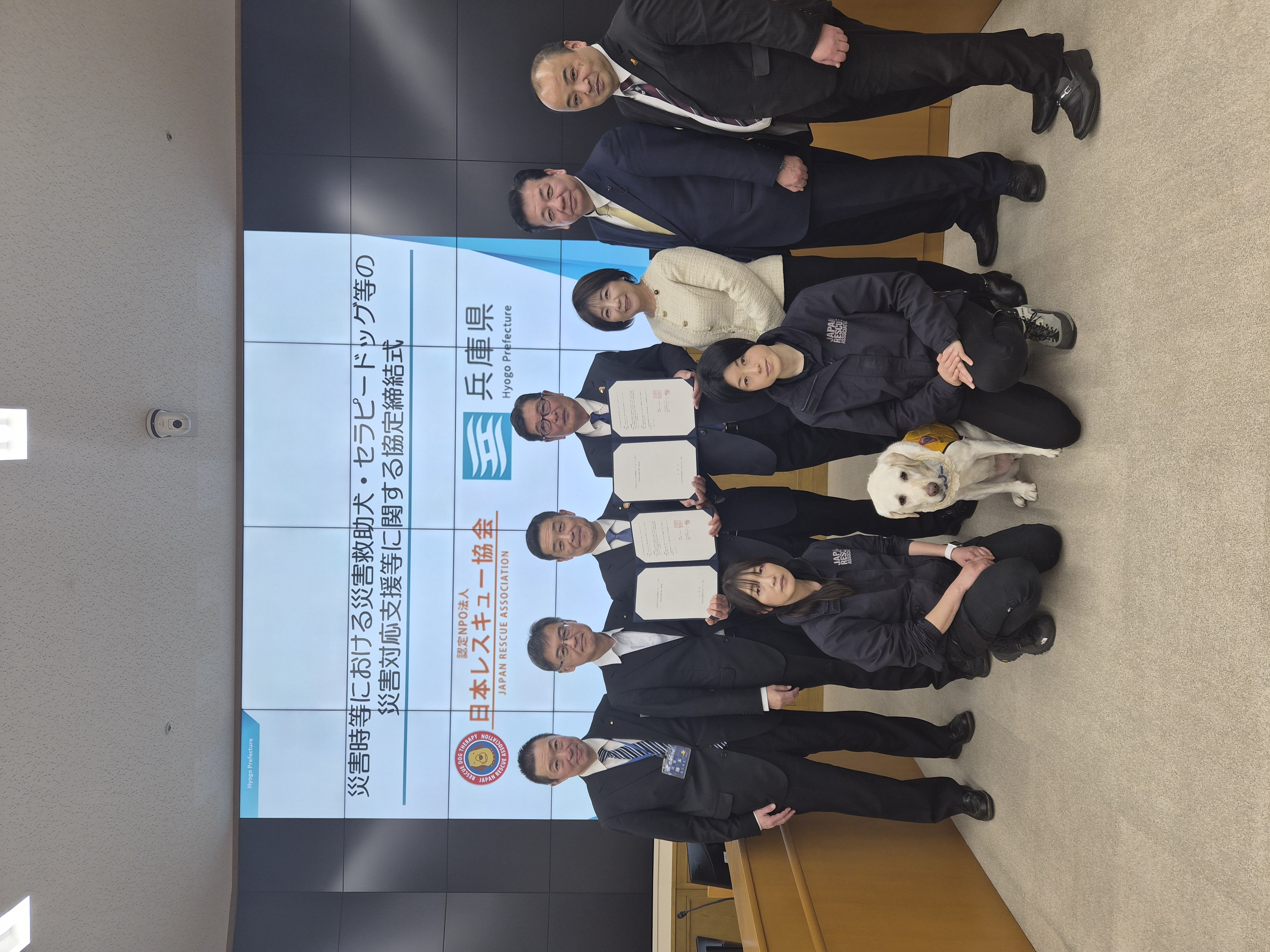 協定締結式の様子(中央左:池田防災監、中央右:森崎理事長、災害救助犬左:ヴィー、災害救助犬右:マイル)