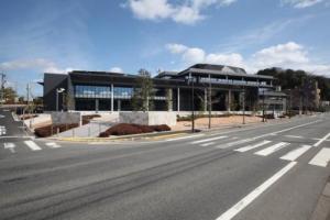 左側から (1)大学学舎(外観)、(2)舞台芸術実習公演(Performing Arts Project)、(3)学生寮(外観)