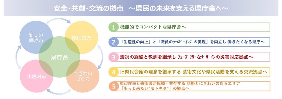 新庁舎等の整備にあたっては、(1)県庁舎の安全性・利便性等の確保、(2)職員の新しい働き方の実現、(3)災害対応力の強化、(4)県民交流機能の再整備、(5)モトキタエリアのにぎわいづくりの5つの視点で必要な機能を確保するとともに、複数の機能が相互に連携し、補完し合うことで整備の最適化を図るとともに、相乗効果を生み出していくことを目指します。