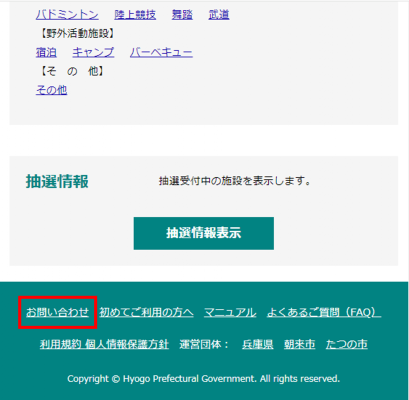 システムのトップページにて「お問い合わせ」をクリックすると、施設一覧が表示されます。