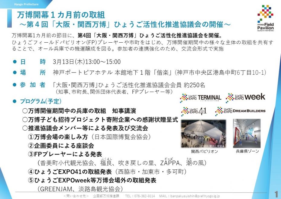 万博開幕1か月前(3月13日)の節目に、第4回「大阪・関西万博」ひょうご活性化推進協議会を開催します。
