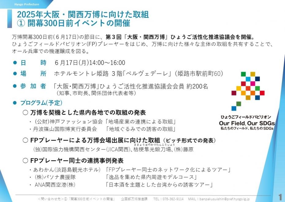 ひょうごフィールドパビリオン(FP)プレーヤーをはじめ、万博に向けた様々な主体の取組を共有することで、オール兵庫での機運醸成を図ります。