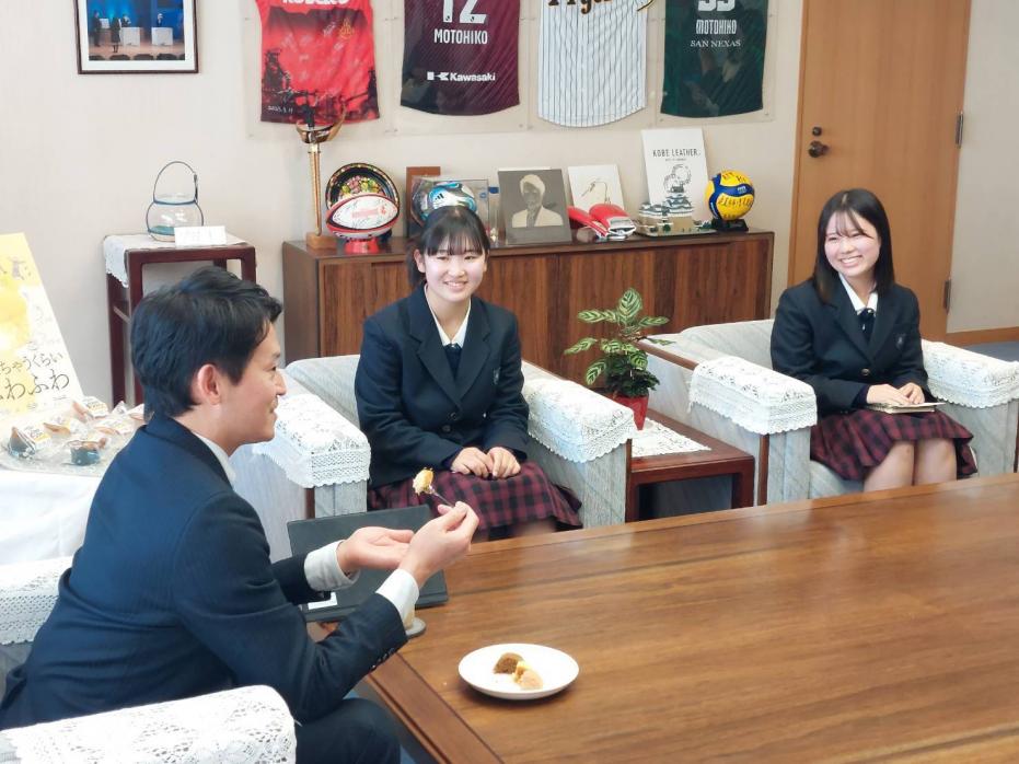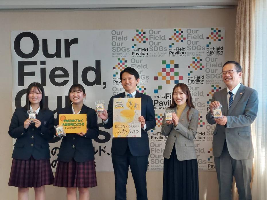 代表生徒2名とオイシス担当者が兵庫県庁を訪問し、齋藤知事に取り組みや商品の説明を行いました。