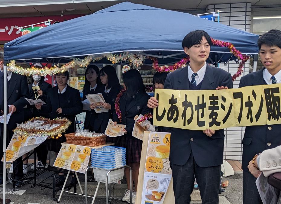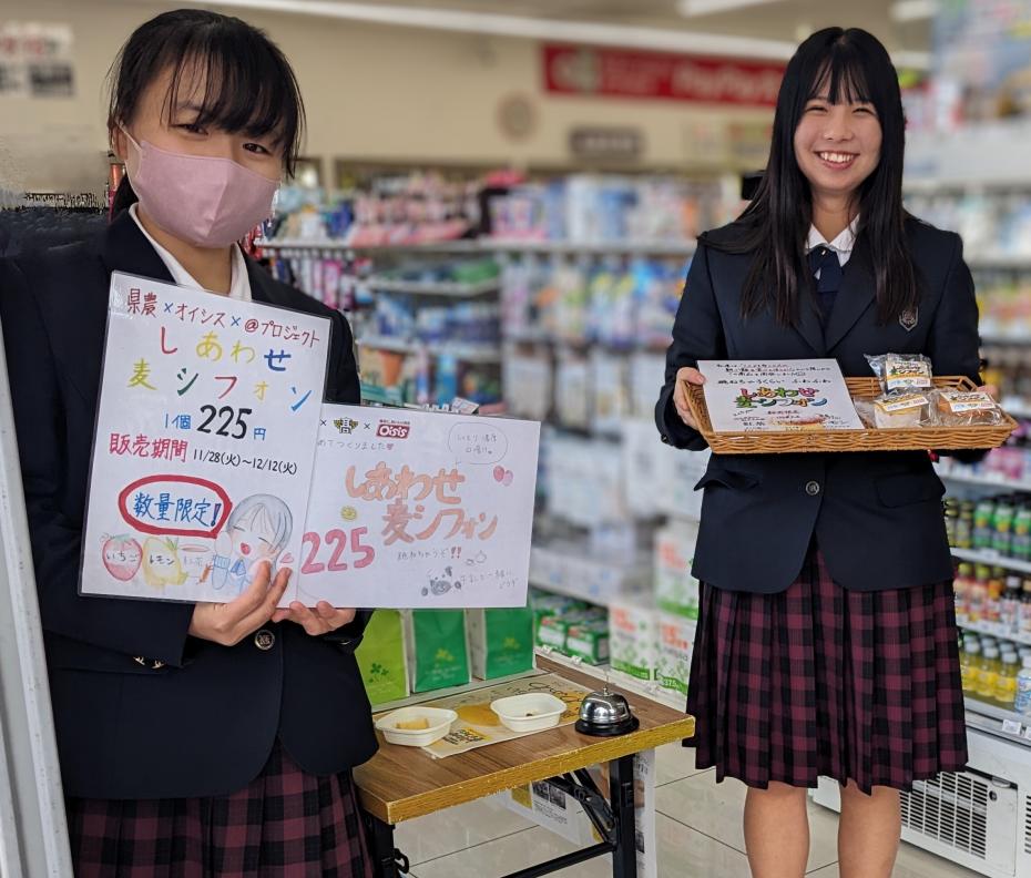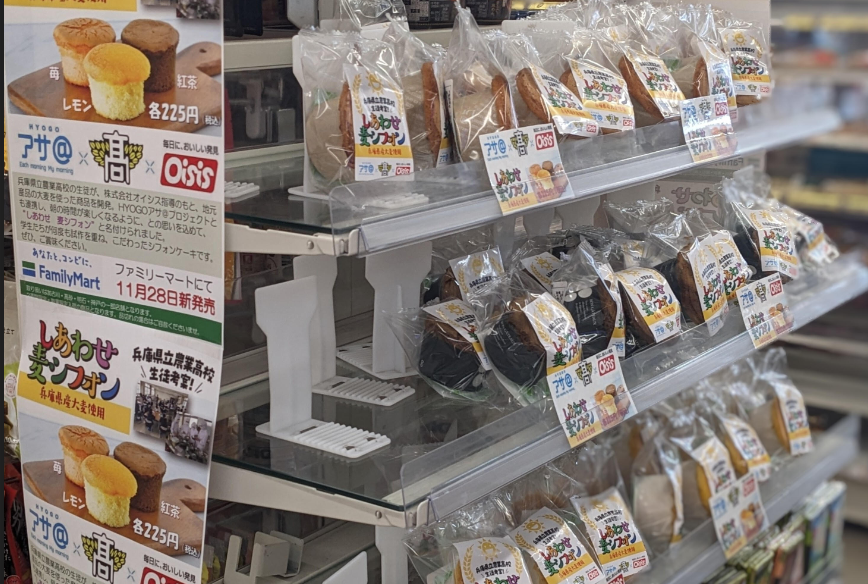 発売日当日、セブン-イレブン東加古川駅北口店、ローソン加古川鶴池店、ファミリーマートJR東加古川駅前店の3店舗でPRイベントを開催。生徒たちが店頭でシフォンケーキの魅力をPRしたところ、多くの来店者の方々に手に取ってもらうことができました。