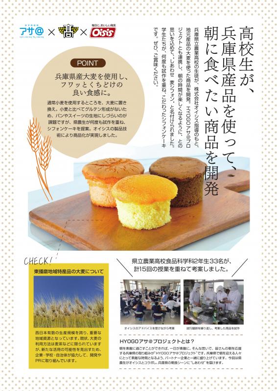 兵庫県立農業高校の生徒が株式会社オイシス指導のもと、地元食材を活用した朝食向けの商品を開発。開発のコンセプトは「若い世代が朝食に食べやすいこと」と「東播磨地域特産の大麦を広めること」。