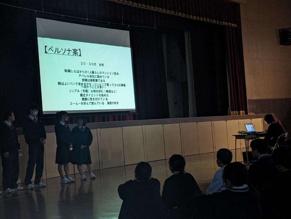 各クラスから2グループの計8グループがプレゼン会に進出し、前回のフィードバックを受けて改善した「商品案」「ペルソナ案」を発表。