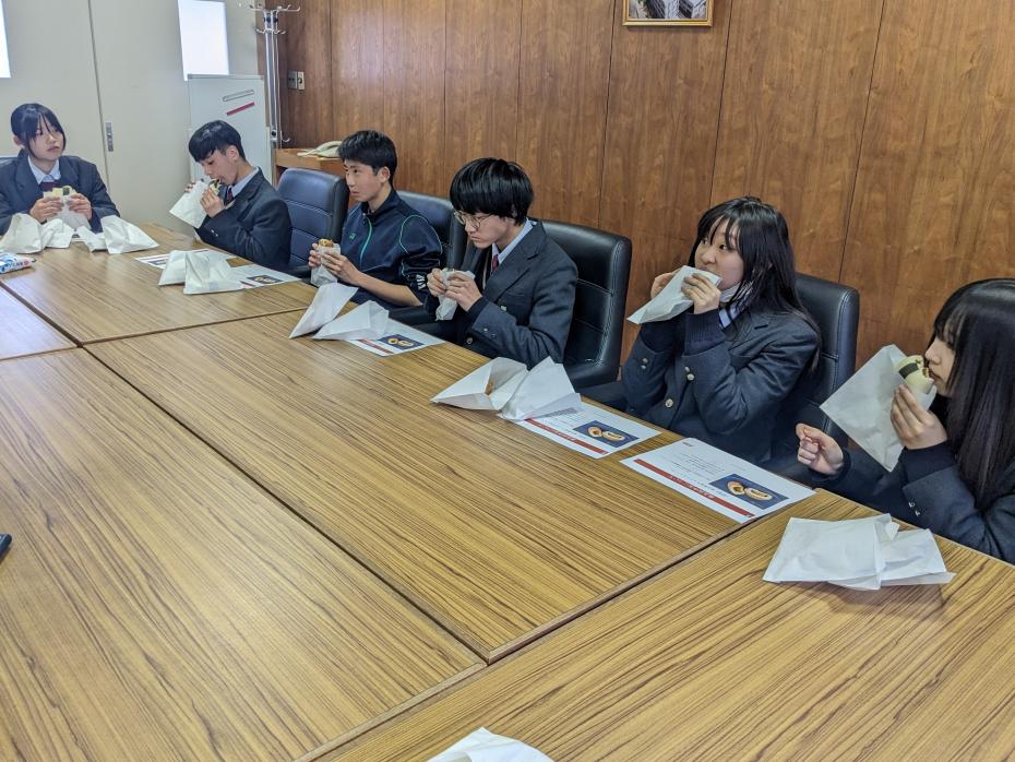 提案したグループの学生たちに、商品化の話し合いを進めるべく、第1回試作品の試食をしてもらいました。「もう少し甘い方が」や「こちらの方が子供たちには食べやすい」など様々な意見がありました。学生たちの意見をもとに、商品の調整が行われます。