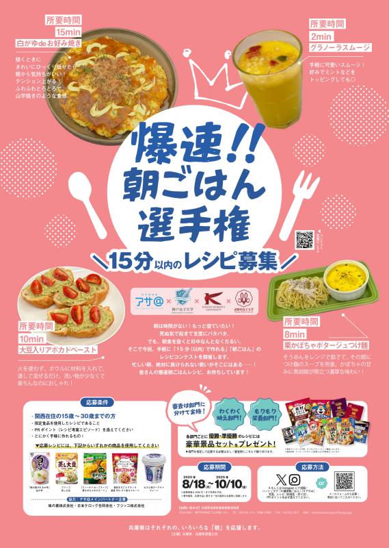 「爆速‼朝ごはん選手権」レシピコンテストは、神戸女子大学・甲南女子大学・武庫川女子大学の学生が主体となって考案し、HYOGO アサ@プロジェクトと協力しながら、朝食摂取率の向上を目指しています。