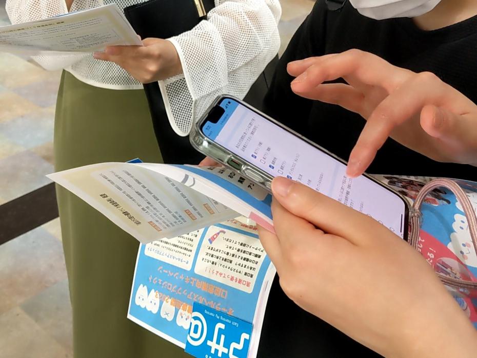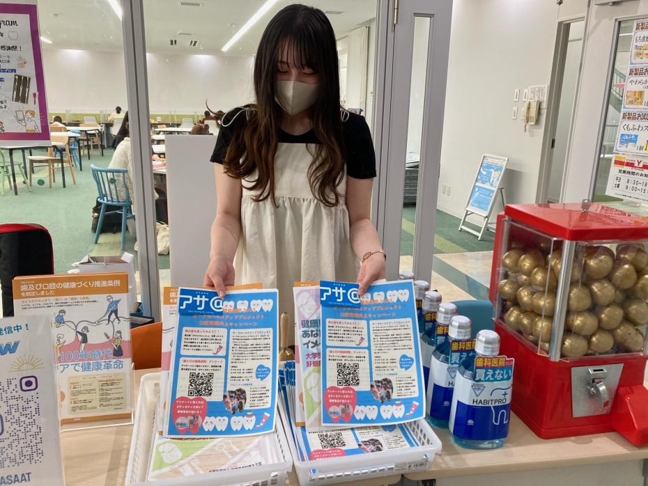 「おーらる歯ぴねす」のメンバーが、啓発ちらしを配布。興味を持った学生に呼びかけを行いました。