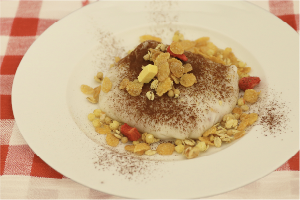 - ココアパウダーをふるい、グラノーラ10gをトッピングして完成。