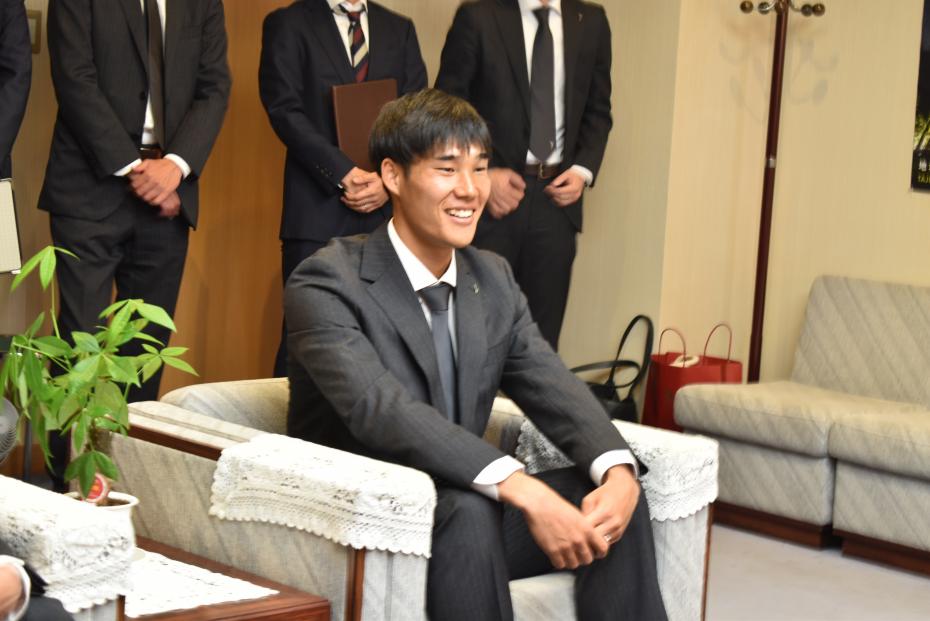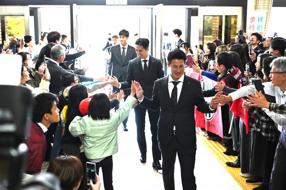 楽天ヴィッセル神戸の千布勇気社長は、「スポーツを通じて地域の復興、若者に夢を与えることで貢献していきたい」と述べ、吉田孝行監督からは、「常に感動や勇気を与える存在として、これからも謙虚に向上心を持って頑張っていく」と今後の抱負を語りました。兵庫県尼崎市出身の山川哲史選手からは「県民皆様の応援が大きな力になった」と感謝の言葉を述べました。