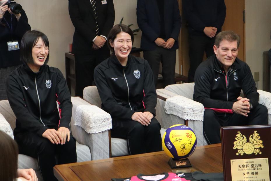 ヴィクトリーナ姫路の社⻑、監督、選⼿らが、⼥⼦バレーボール皇后杯全⽇本選⼿権⼤会優勝の報告のため、齋藤知事を表敬訪問。現在、上位争いを繰り広げるSV リーグでのタイトル獲得に向けての意気込みも伺いました。あわせて、スポーツ振興や次世代⼈材育成などの分野で継続した取り組みを⾏うため、県はヴィクトリーナ姫路と包括連携協定を締結しました。