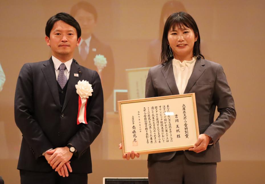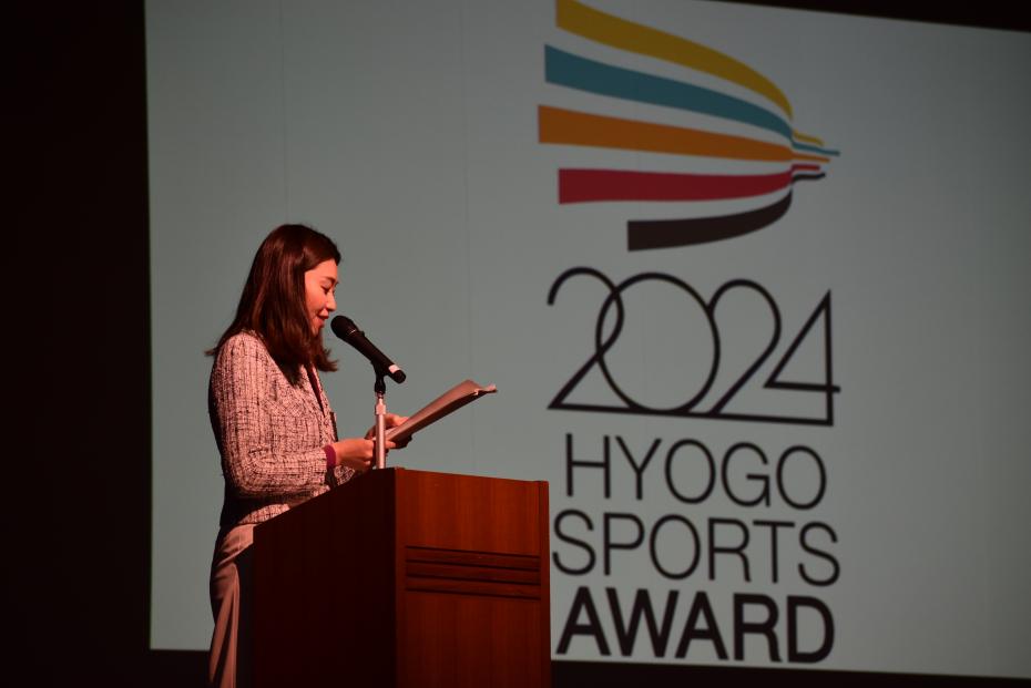 2024年に行われた国際大会及び全国大会において優秀な成績を残した兵庫県にゆかりのあるスポーツ選手やスポーツの振興に功労のあった方に対し、その功績を讃えるため表彰式を開催。会場には355名の受賞者が集まり、オリンピックをはじめ、様々な国内外の大会で顕著な成績を収めたアスリートの栄誉を讃える表彰式となりました。また、スポーツと伝統産業のコラボレーションとして、今回の特別賞の副賞には、丹波焼昇陽窯の大上裕樹さんが制作した丹波焼のマグカップ・プレートセットをご用意しました。大上さんには、受賞者の前で副賞を手掛けた思いや丹波焼の魅力についてお話いただきました。
