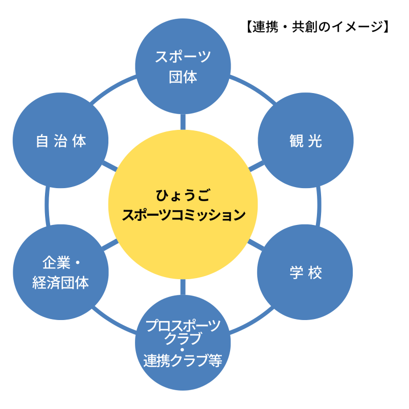 「ひょうごスポーツコミッション」は、官民連携によりスポーツを通して地域活性化につなげる組織です。様々な組織や団体との連携・共創によりスポーツの力を通じて地域に賑わいと誇りを創出し、地域活性化につなげる共創のハブの役割を担います |