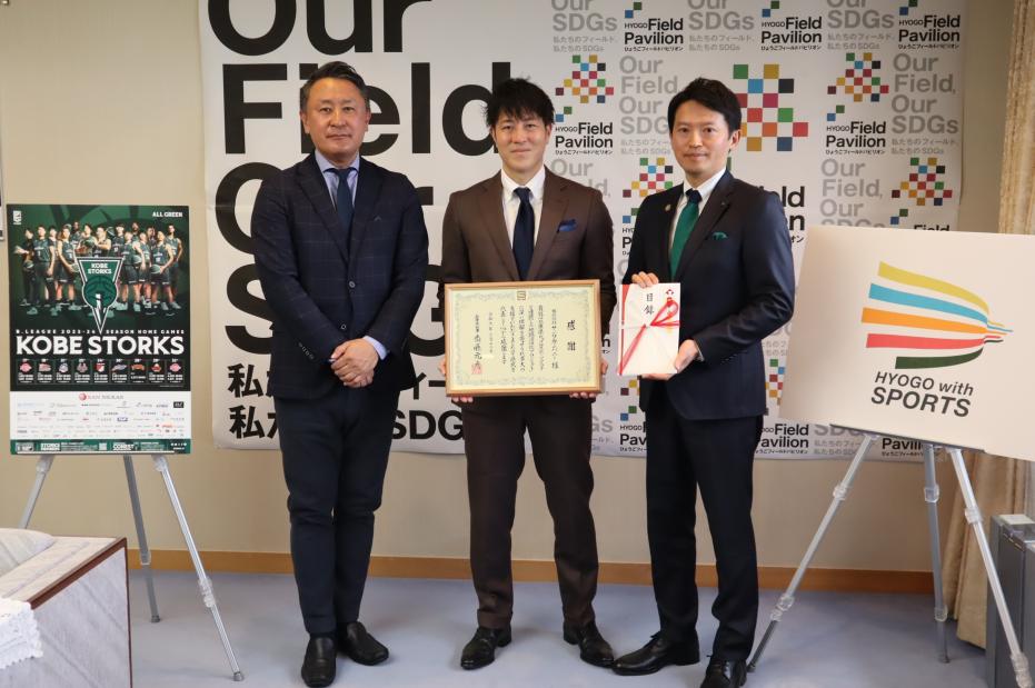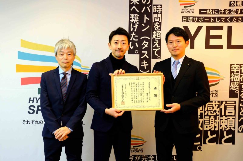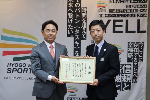 クレジットカードの基幹システム開発などITサービスの提供を手掛けるTIS株式会社の音喜多常務執行役員・デジタルイノベーション事業本部事業本部長と岡田ソーシャルイノベーション事業部副事業部長が兵庫県庁を訪問。企業版ふるさと納税制度を活用した寄附に対し、田中県民生活部長から感謝状を贈呈。音喜多常務執行役員は「決済サービスなどの得意な領域で地域に貢献し、子ども達の観戦に向けて協力したい」と語り、田中部長は「子ども達に兵庫のスポーツやスポーツクラブに関心を持ってもらい、将来のファンになってもらうことに繋がる」と寄附への感謝を述べた。
