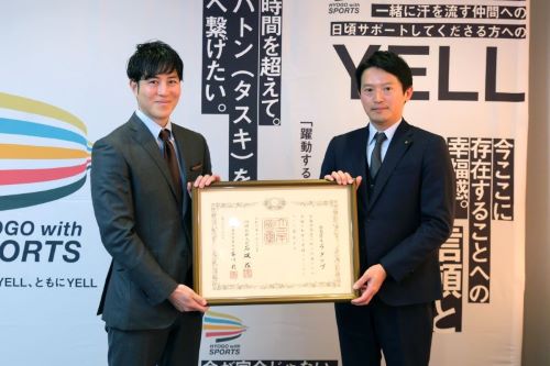 住設・建材EC事業などを手掛ける株式会社ミラタップの山根社長が兵庫県庁を訪問。同社は企業版ふるさと納税制度を活用した寄附により紺綬褒章を受章。齋藤知事から紺綬褒章の伝達及び感謝状の贈呈が行われた。山根社長は、「子ども達の明るい未来を創っていくことが企業理念。スポーツを通じて、子ども達に夢を持ってもらいたい」と語り、齋藤知事は、寄附金について「子ども達のプロスポーツ観戦招待などに活用させていただき大変喜ばれている」と寄附への感謝を述べた。