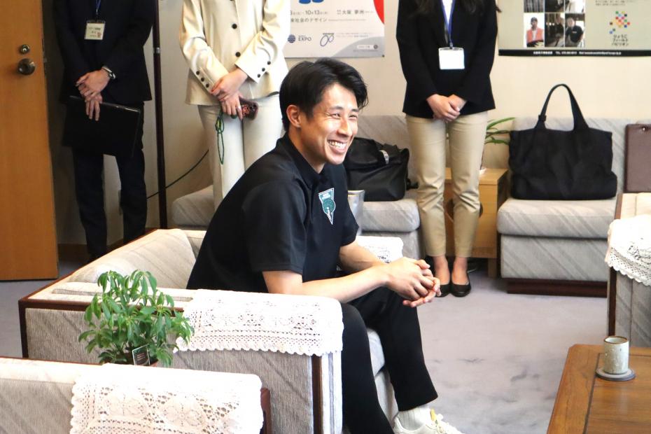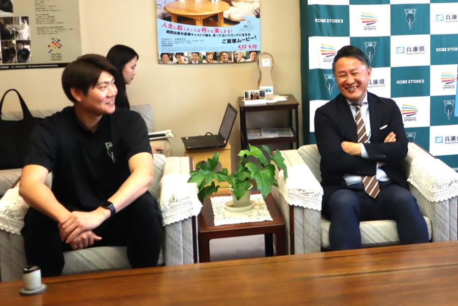 神戸ストークスの渋谷順代表取締役社長、中西良太選手、渡邊翔太選手が齋藤知事を表敬訪問するため来庁されました。渋谷社長からは、目標に掲げていたシーズン入場者9万人の達成について、中西良太、渡邊翔太の両選手からは、シーズン終了の報告にあわせ、来シーズンに向けての抱負が語られました。