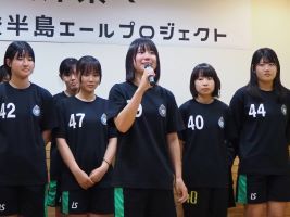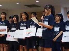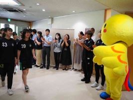 七尾高校女子サッカー部11人は、約7時間かけて兵庫県庁へ到着。3日間ともに行動する北須磨高校女子サッカー部や、INAC神戸レオネッサの髙瀬愛実選手や井手ひなた選手、プロジェクトの協力者及び支援者が一堂に会し、七尾高校を拍手で迎えました。歓迎式では、齋藤知事、髙瀬選手がメッセージを送り、北須磨高校 鈴木菜衣さん、七尾高校 橋本和花さんがプロジェクトの意気込みを語りました。