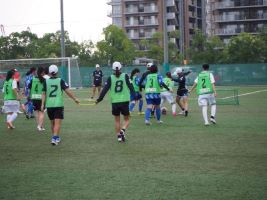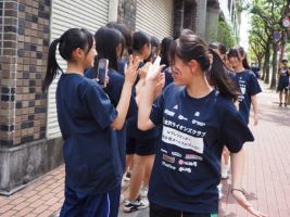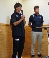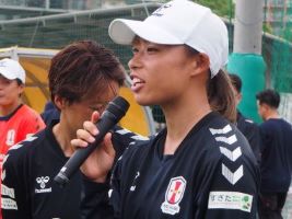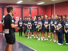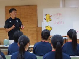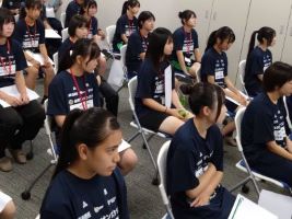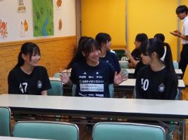 INAC神戸のトップ選手によるサッカー教室を実施。井手ひなた選手の挨拶の後、選手と一緒に行ったアップや練習では、たくさんの笑い声が響きました。終始、高校生は圧倒的なプロの技術に驚きを隠せない様子。サッカー教室の後は、七尾高校と北須磨高校の交流試合を実施。また、大塚製薬株式会社が熱中症の講義を行いました。