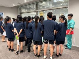 INAC神戸の安本氏が、ノエビアスタジアム神戸を案内。普段は入ることのできないエリアに入り、プロ選手になりきって入場する等の貴重な体験に、高校生は笑顔を弾ませました。