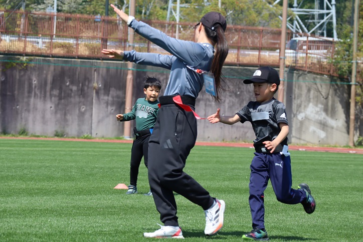 コベルコ神戸スティーラーズ、株式会社ECC、一般社団法人兵庫県ラグビーフットボール協会の協力のもと開催。株式会社ECCの講師が英語でゲームの説明しました。「Nice try!」「Hands up!」など、英語が飛び交うラグビー教室になりました。