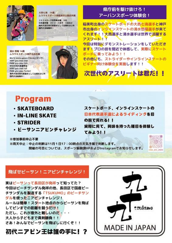 ムラサキスポーツ様にご協力いただき、スケートボード、インラインスケート、ストライダーのビギナー向け体験会を実施します。今回のイベントでは、ムラサキスポーツの契約選手であるスケートボードの大西七海選手と、インラインスケートの清水悠陽選手にご指導いただくとともに、デモンストレーションをしていただきます。