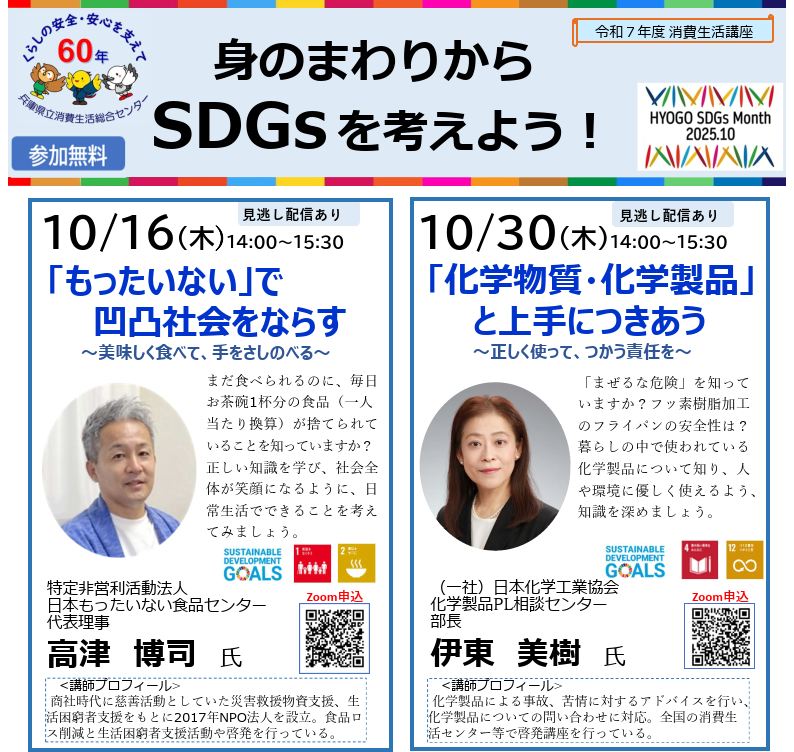 ひょうごSDGs月間にあわせ、「身のまわりからSDGsを考えよう!」をテーマに2講座を開催します。