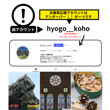 偽アカウントは、類似のユーザー名やアイコン、プロフィール、投稿内容などを無断で使用し、公式アカウントの投稿内容を転載しています。フォロー申請やDM(ダイレクトメッセージ)を発信してくる可能性がありますが、兵庫県とは一切関係ありません。