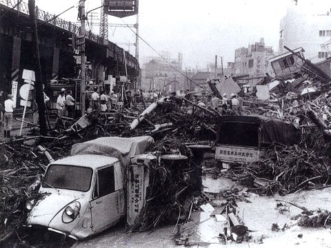 流された自動車や流木がうず高く積もった宇治川商店街付近 (神戸市中央区)
