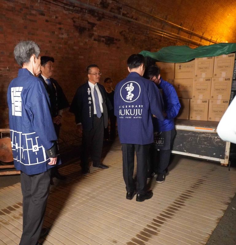 蔵出しされた日本酒「隧ZUI」はトラックで運ばれ、蔵出しを祝って鏡開きを行いました。