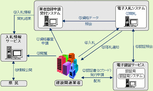 電子入札とは、公共事業に関する業者登録申請受付から入札、開札に至る一連の手続きをインターネットを経由して電子的に行うことです。