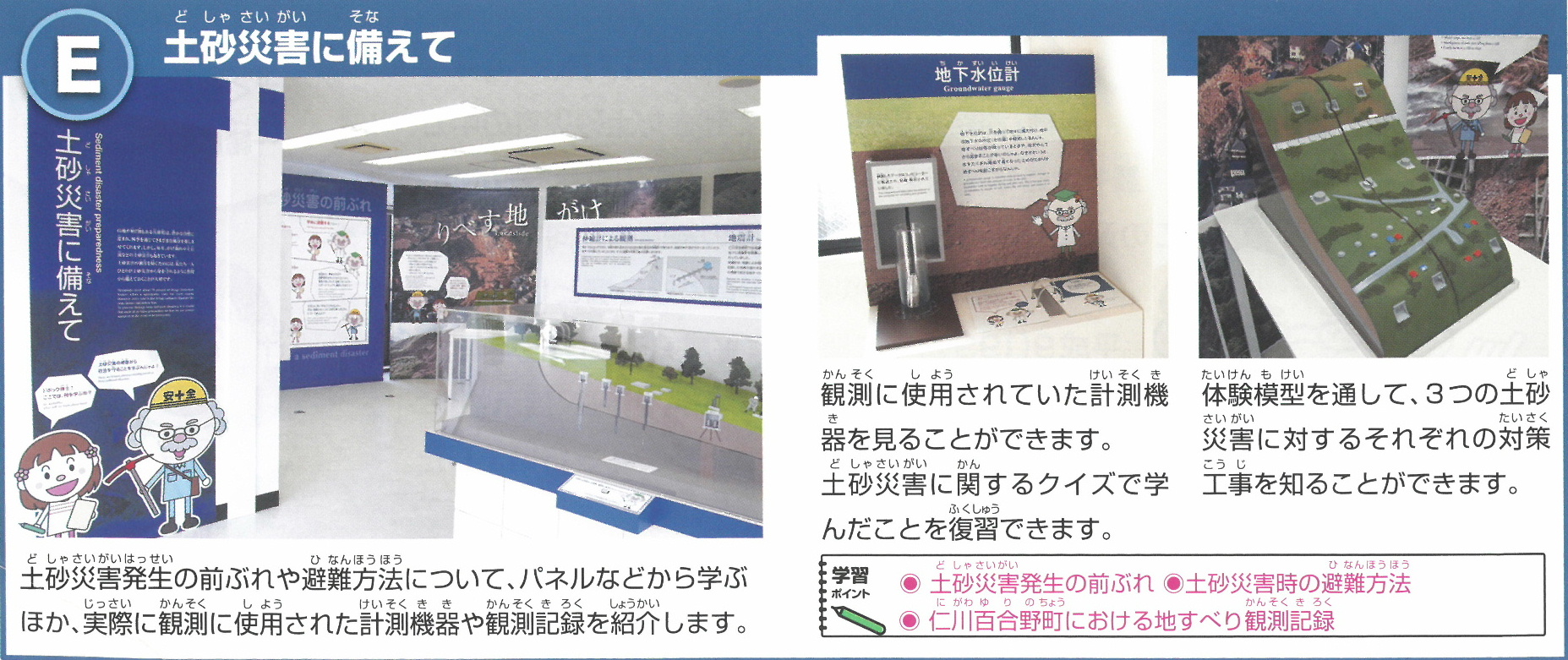 激甚化・頻発化・広域化する災害に備え、各種防災情報が避難行動に有効につながるようますます防災学習の役割が重要になっています。そこで、地すべり資料館では、これまでの一般の見学に加えて、土砂災害や対策工事などに豊富な経験を持った兵庫県砂防ボランティア協会(外部サイトへリンク)と連携し、より実践的で専門的な防災学習の場をご提供します。
