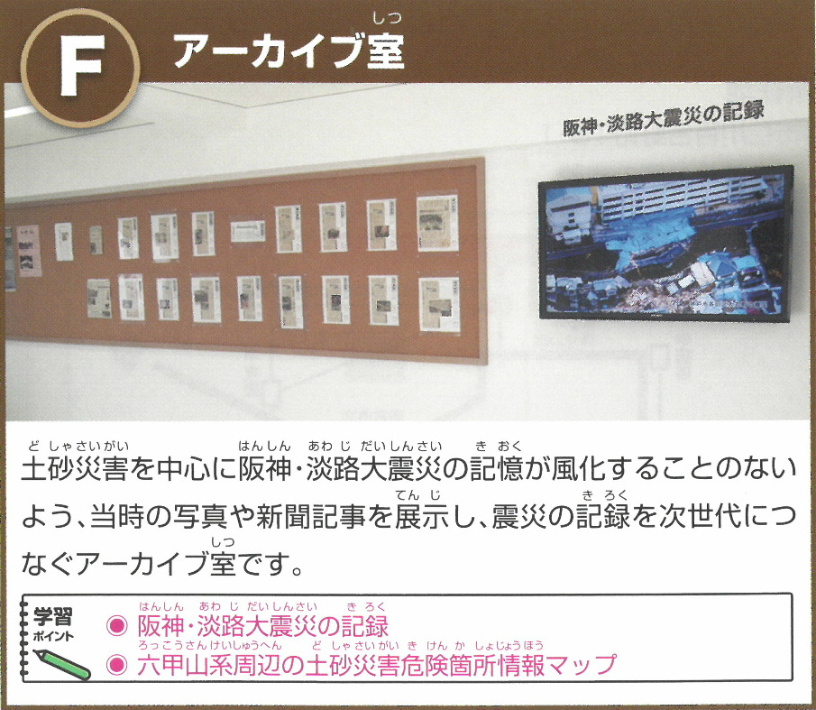 平成7(1995)年1月17日、阪神淡路大震災によって発生した大規模な地すべりで、仁川百合野町地区では13戸の家屋が倒壊し、34名の尊い命が奪われました。平成9年11月に開館したこの地すべり資料館は、当時の被害やその後の対策工事、地盤安定確認のための観測データ、また土砂災害のしくみ等について伝えてきましたが、震災20年を迎えた平成27年(2015)年1月17日、展示内容を更新・改装しリニューアルオープンしました。