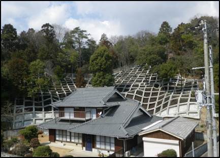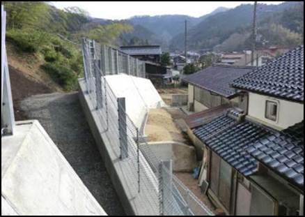 斜面の下部に設置することによって、斜面脚部の安定、斜面中段での小規模な崩壊の抑止、斜面上部からの崩壊土砂の斜面下部での待ち受けのための工法です。