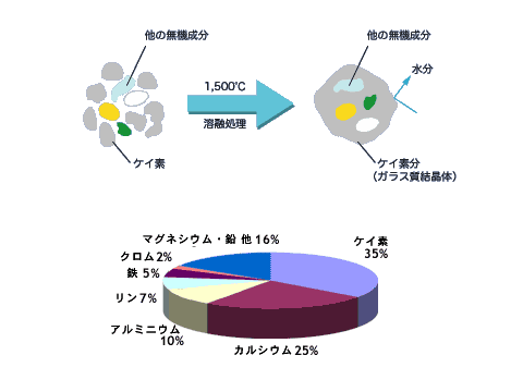 1,500℃の高温で溶融処理するため、ダイオキシン等の有機(化合)物は揮散し、残りの無機成分はガラス質結晶体により封じ込められています。