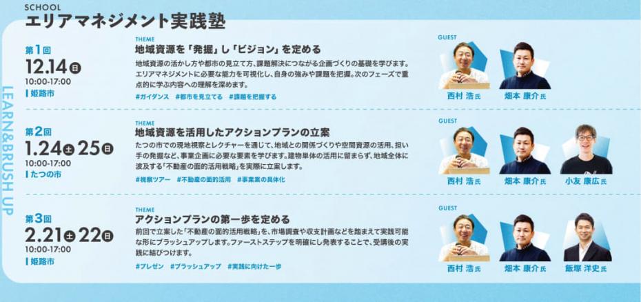 第3弾では、エリアマネジメントの担い手を育成するプログラムを実施します。まちづくり実践者によるレクチャーとワークを通じて、実際に空き家等を活用して行う事業を考え実践する力を身につけます。